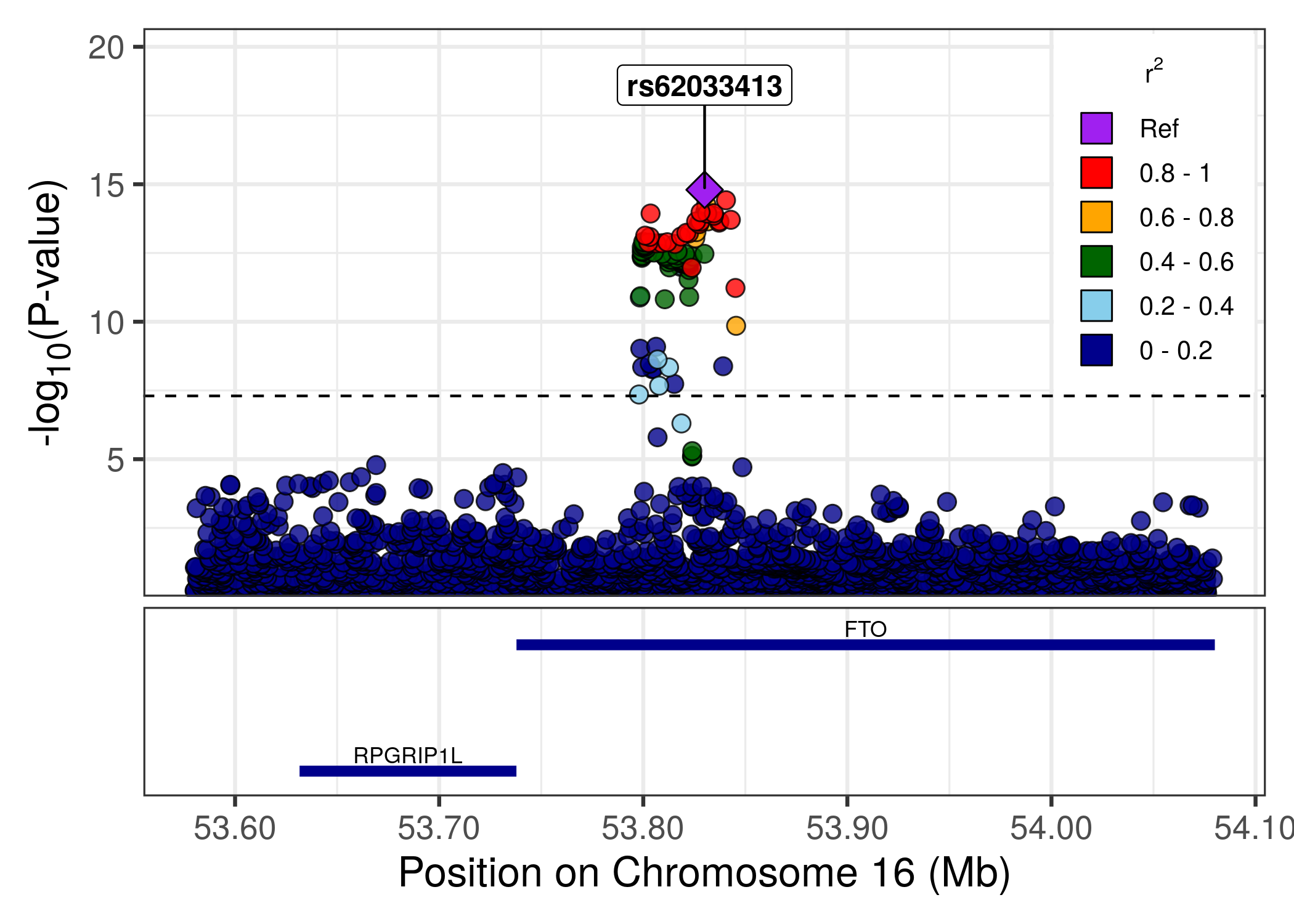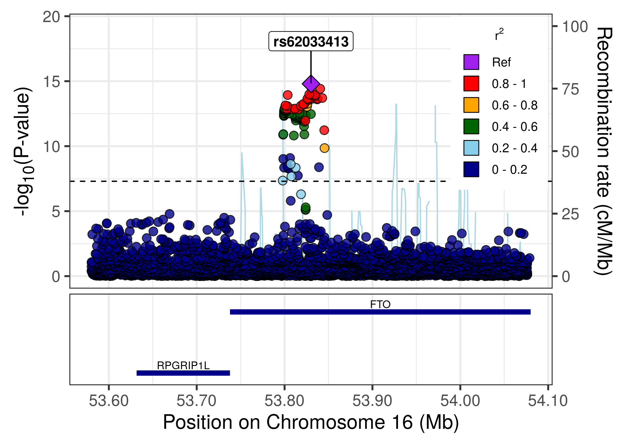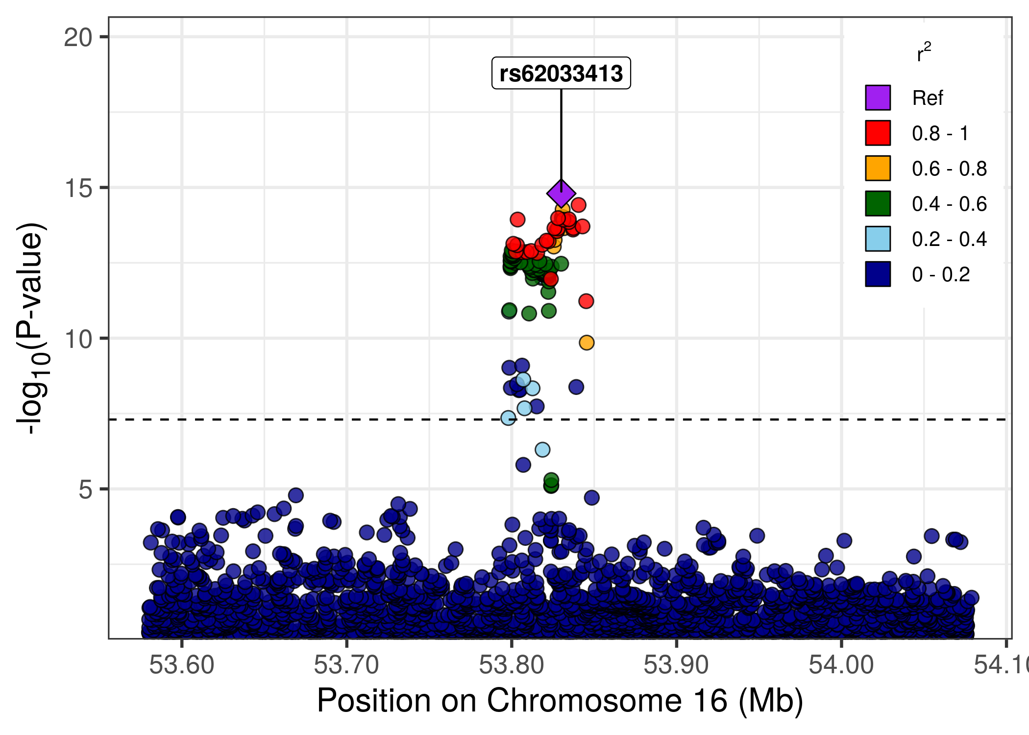 ld_extract_locuszoom(chrom = 16, pos = 53830055, ref = "C", alt = "G", start = 53830055 - 5e5, stop = 53830055 + 5e5, genome_build = "GRCh37", population = "ALL", metric = "rsquare")