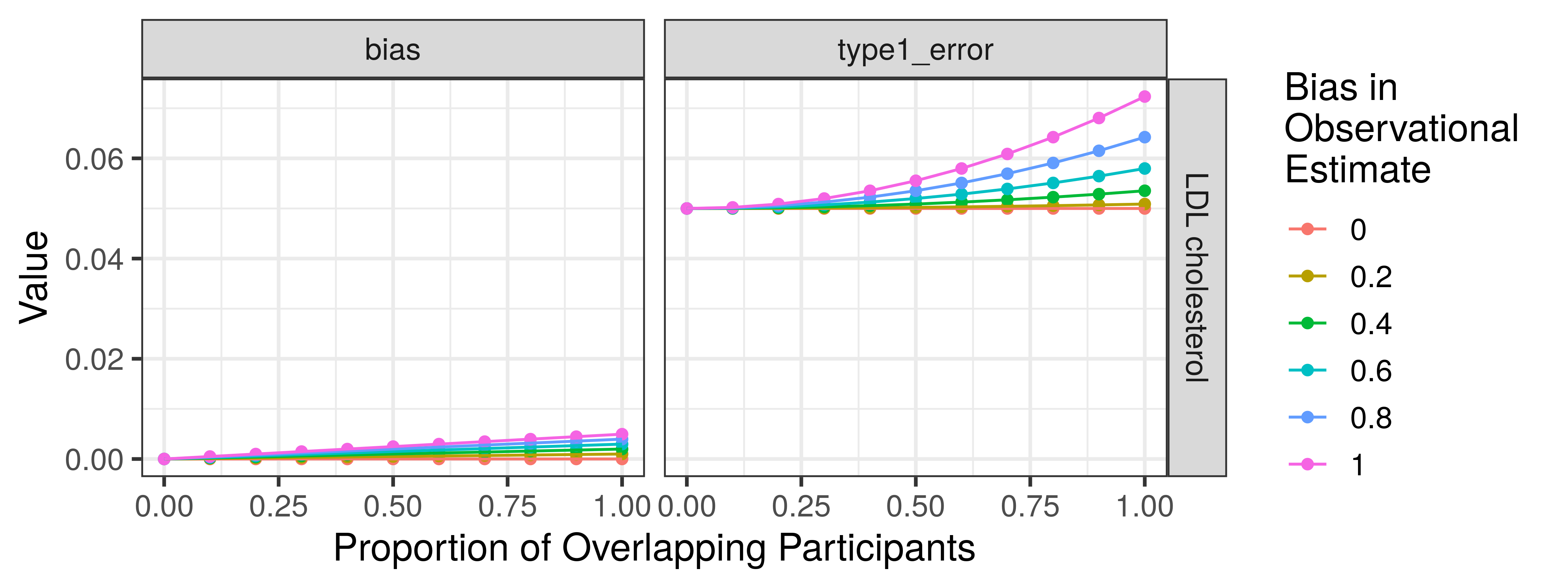 unnest(res)We can optionally plot our results. We see that as the proportion of sample overlap increases, so does type 1 error, while bias remains relatively small. Type 1 error and bias are also magnified as the bias in the observational estimate increases: